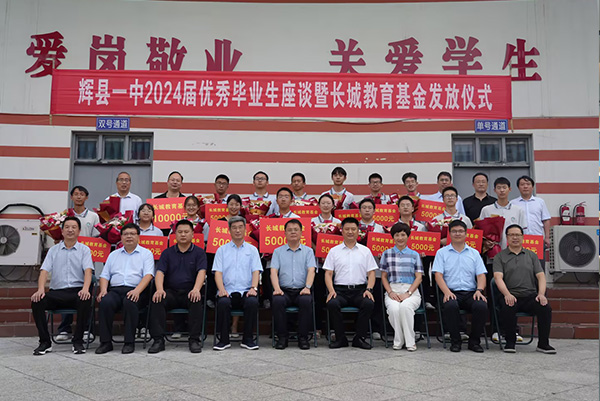 8月9日,輝縣市第一高級中學2024屆優秀畢業生座談暨長城教育基金發放儀式在市第一高級中學隆重舉行。市委書記李繼游,市委副書記、市委辦公室主任畢捷,副市長程龍及教體局、市第一高級中學主要負責同志,長城集團董事長王紀中和市第一高級中學2024屆優秀畢業生代表參加儀式。